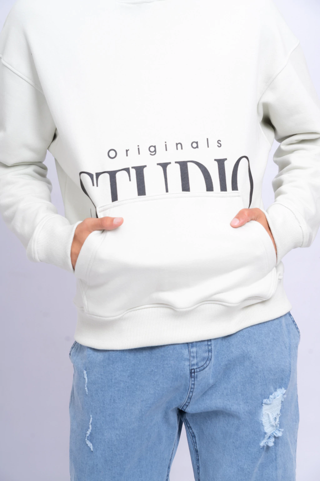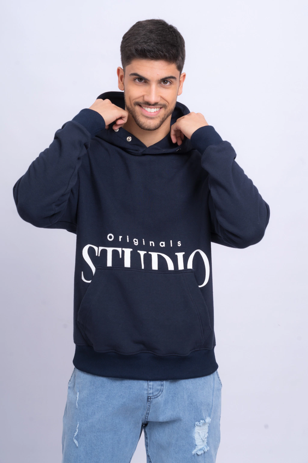 Buzo con capucha, 100% algodón rustico con bolsillo canguro. Cuenta con broches en su escote. Diseño de estampa Originals Studio.