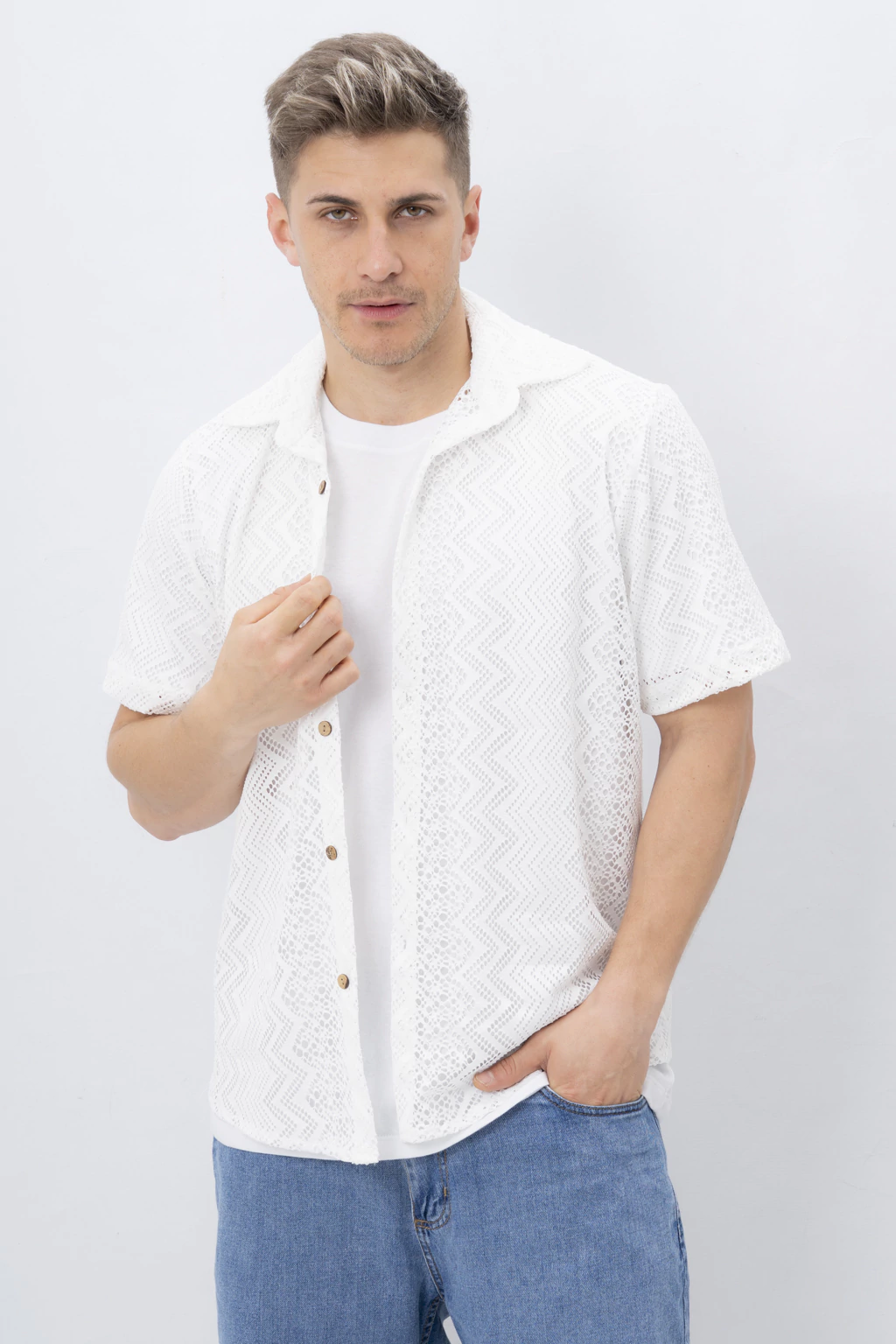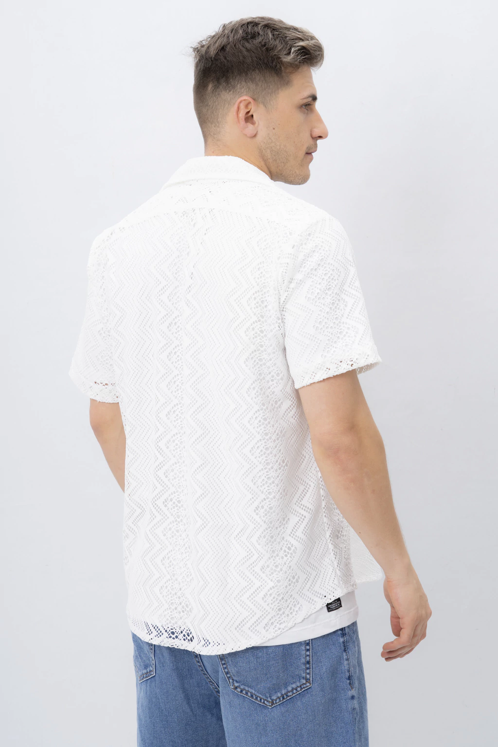 Camisa Broderie Descubrí esta camisa de manga corta con cuello camisero, confeccionada con la técnica de broderie, que crea un delicado patrón geométrico en zigzag mediante pequeños agujeros decorativos. Ideal para combinar con una camiseta básica blanca, ofrece un look fresco y elegante.