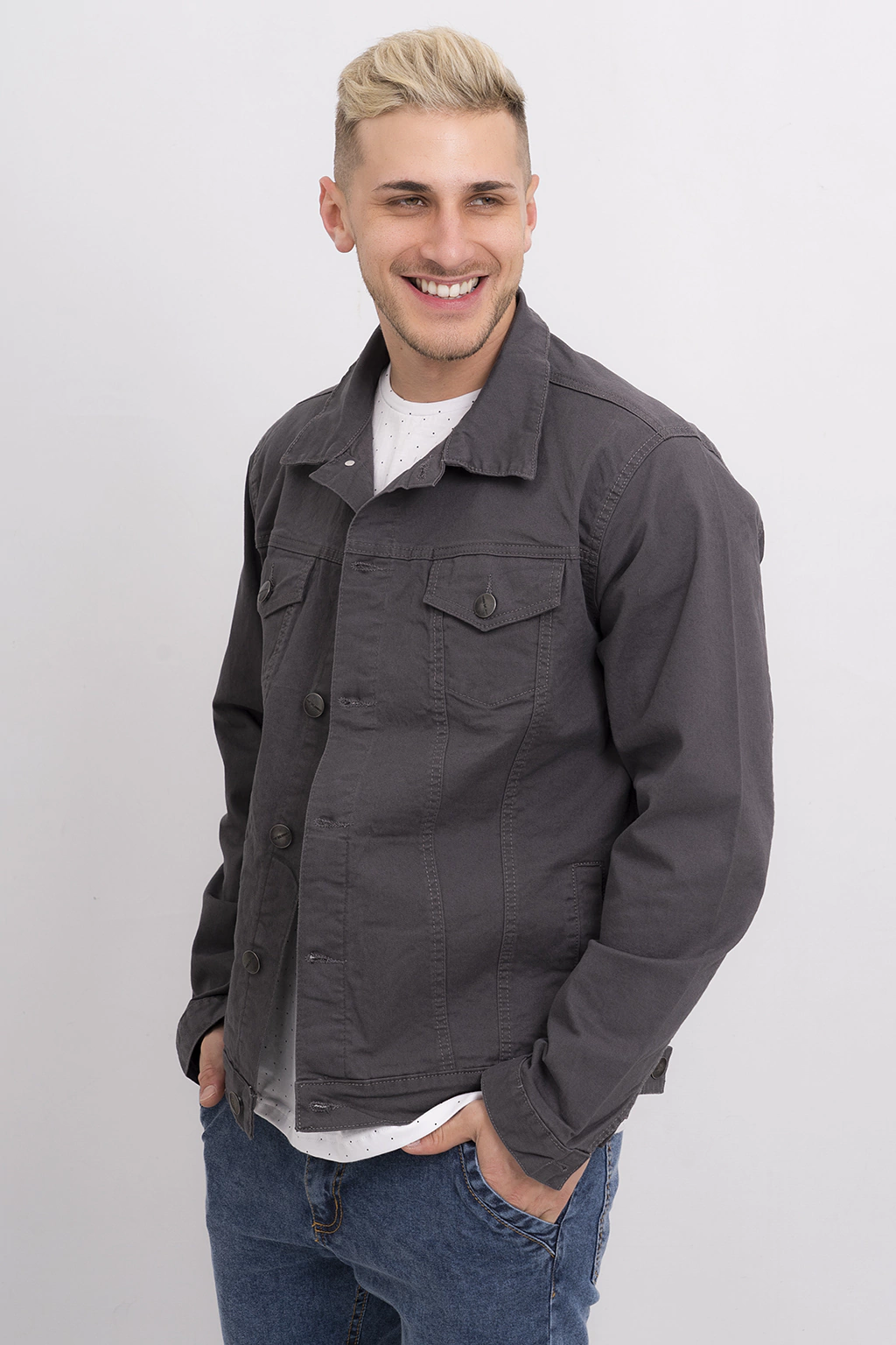Descubrí la Chaqueta confeccionada en Gabardina con spandex, una prenda que combina estilo y comodidad. Su diseño incluye detalles de pinzas con costuras al tono que realzan la silueta, además de botones personalizados de metal que aportan un toque único.