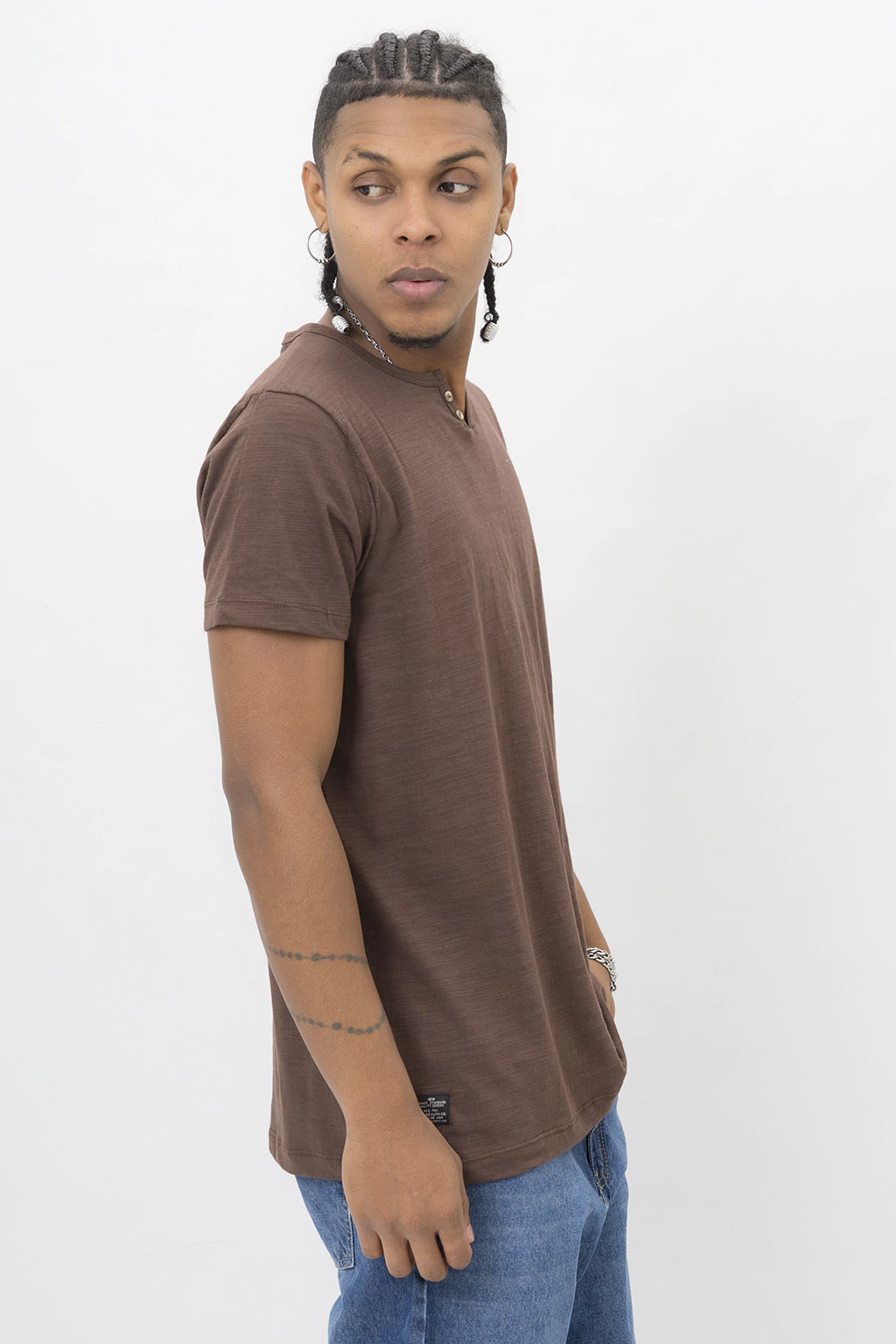 Confeccionada en Algodón Poliester Flame, esta remera de manga corta presenta un corte en V con una cartera de botones. Su calce es regular, ideal para un uso diario cómodo y estiloso. El modelo mide 1,78m y está usando talle L.